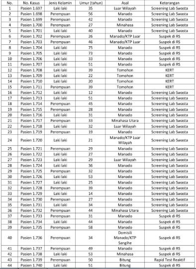 Berikut rincian ke-44 kasus baru konfirmasi positif Covid-19 yang merupakan pasien ke-1.697 sampai 1.740 di Sulut: