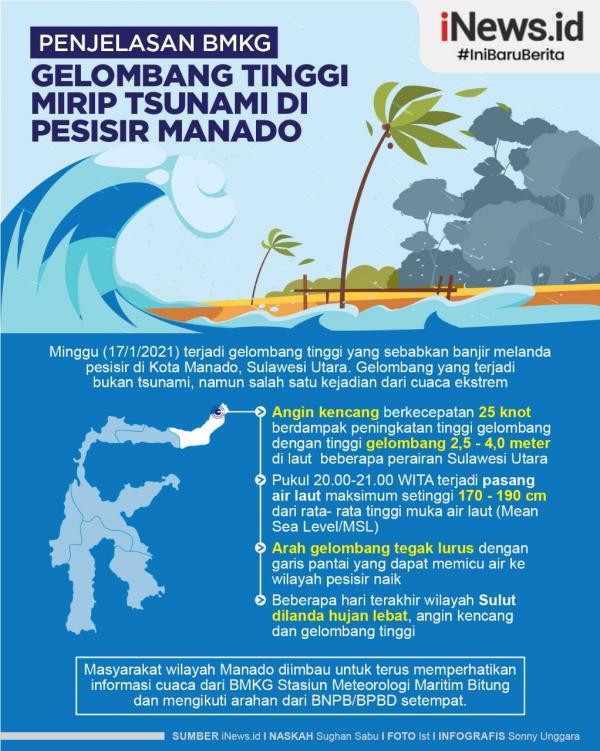 JAKARTA, iNews.id - Gelombang tinggi hingga menyebabkan banjir melanda pesisir Kota Manado, Sulawesi Utara pada Minggu (17/1/2021). Sejumlah video dan foto-foto yang merekam peristiwa tersebut viral di media sosial.