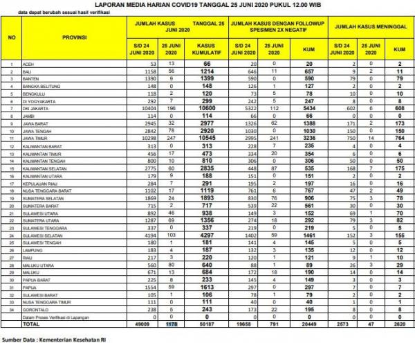 Sementara akumulasi di Indonesia, jumlah kasus Covid-19 per hari ini mencapai 50.187 orang. Sebanyak 20.449 pasien sembuh dan 2.620 meninggal dunia.