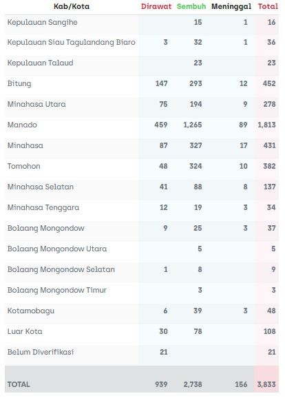 Berdasarkan data corona.sulutprov.go.id sebaran pasien positif terbanyak ada di Kota Manado sebanyak 1.813 orang. Kemudian disusul Kota Bitung 452 kasus, Minahasa 431 dan Tomohon 382 orang.