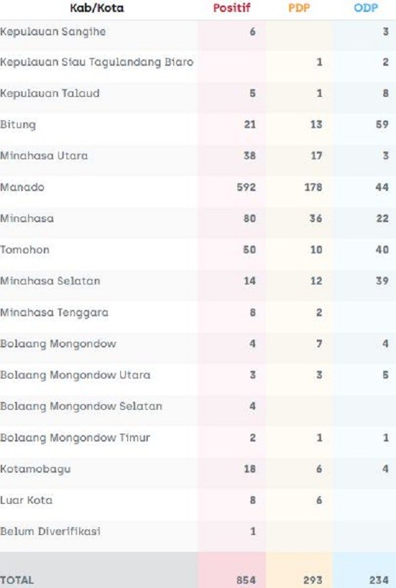 Data yang dihimpun dari corona.sulutprov.go.id, jumlah pasien positif Covid-19 mencapai 854 orang. Perinciannya yakni 638 orang dirawat, 147 pasien sembuh dan 69 meninggal dunia. Selain itu ada sebanyak 293 pasien dalam pengawasan (PDP) yang kini menjalani perawatan di rumah sakit dan 234 ODP.