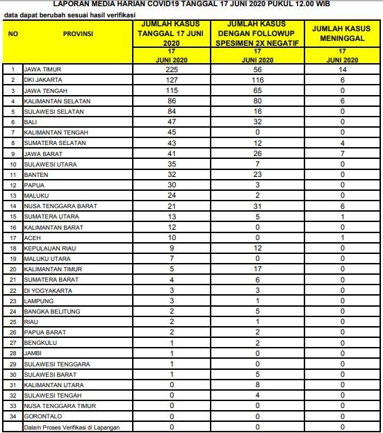 “Jawa Timur melaporkan penambahan 225 kasus, kemudian DKI Jakarta 127,” kata Yuri dalam konferensi pers di Graha Badan Nasional Penanggulangan Bencana (BNPB), Jakarta, Rabu (17/6/2020) siang.